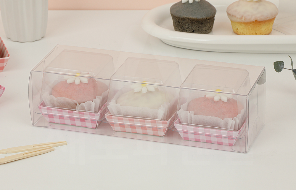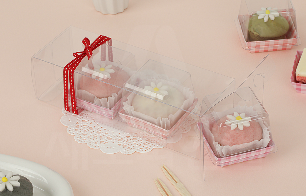 투명한 PET 원단으로 제작되어 식품 포장에 적합하며 높은 투명도로 박스 안에 담긴 디저트가 한눈에 잘 보여 매장 진열이나 선물 포장 시에도 제품의 모양과 색감을 돋보이게 해줍니다.