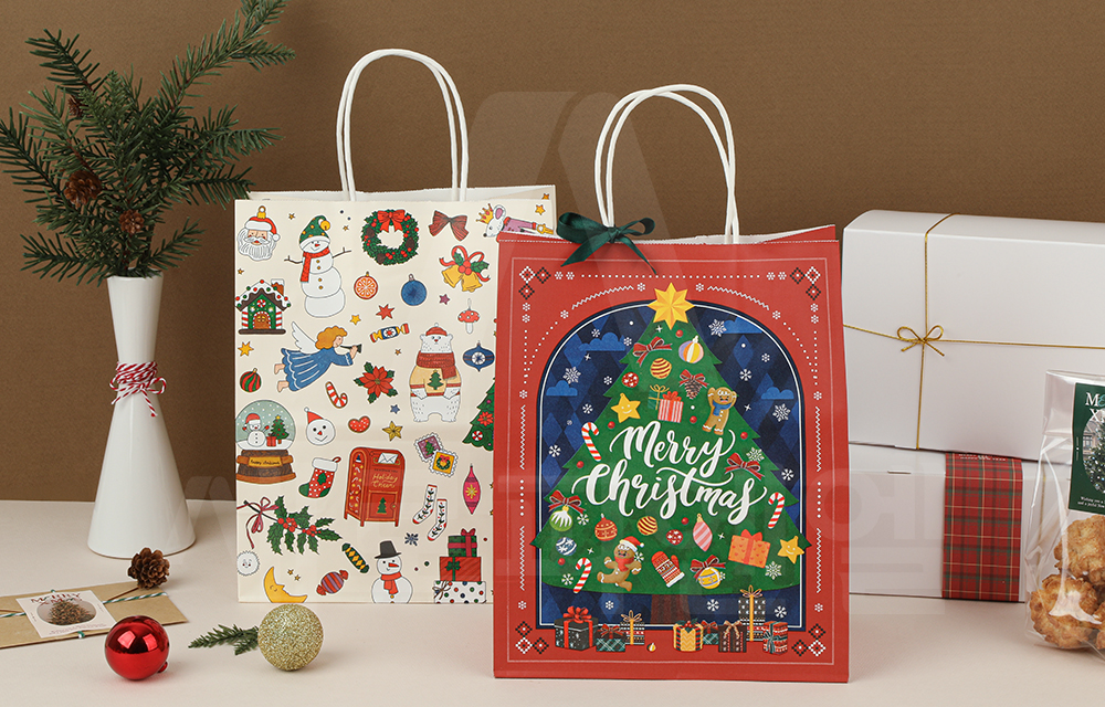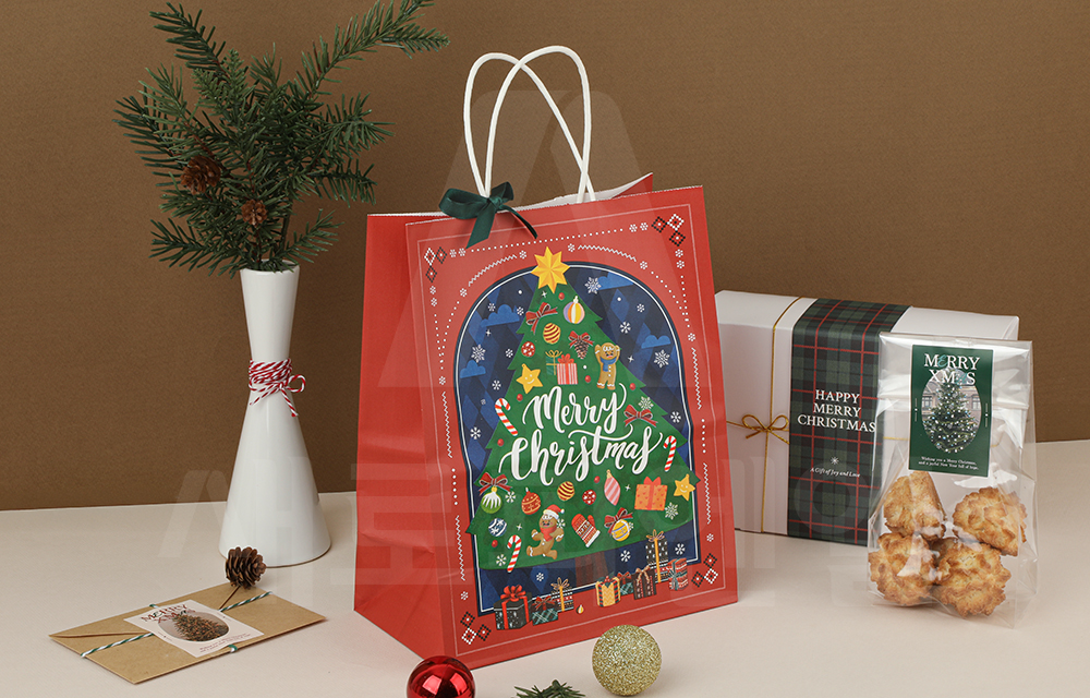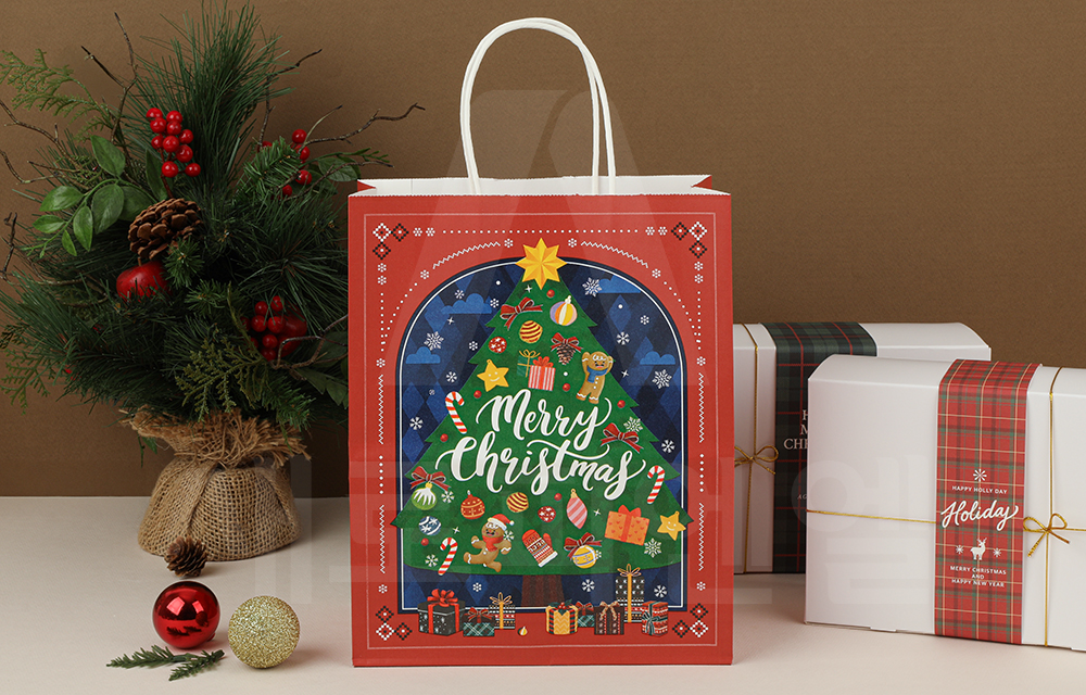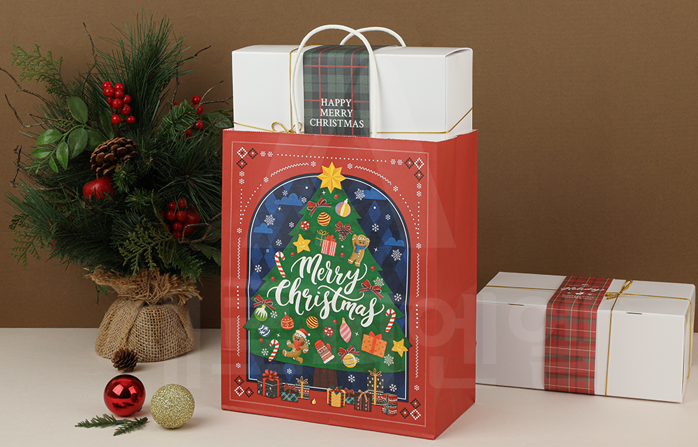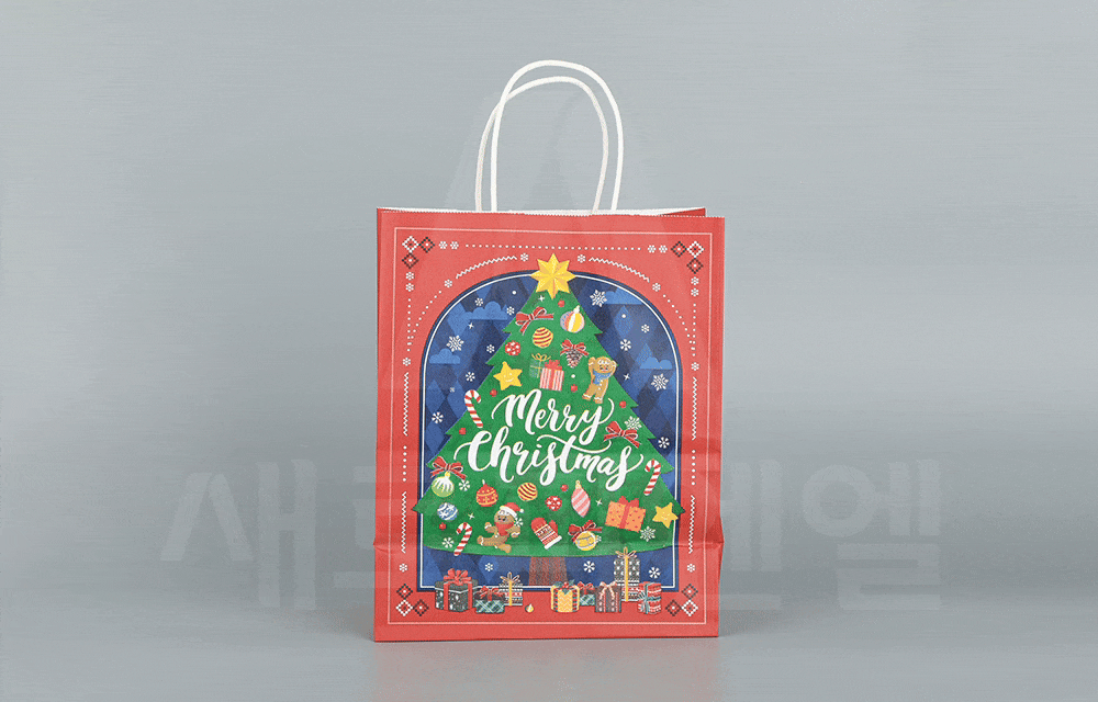 화려한 트리 일러스트가 담긴 크리스마스 디자인 종이쇼핑백입니다.