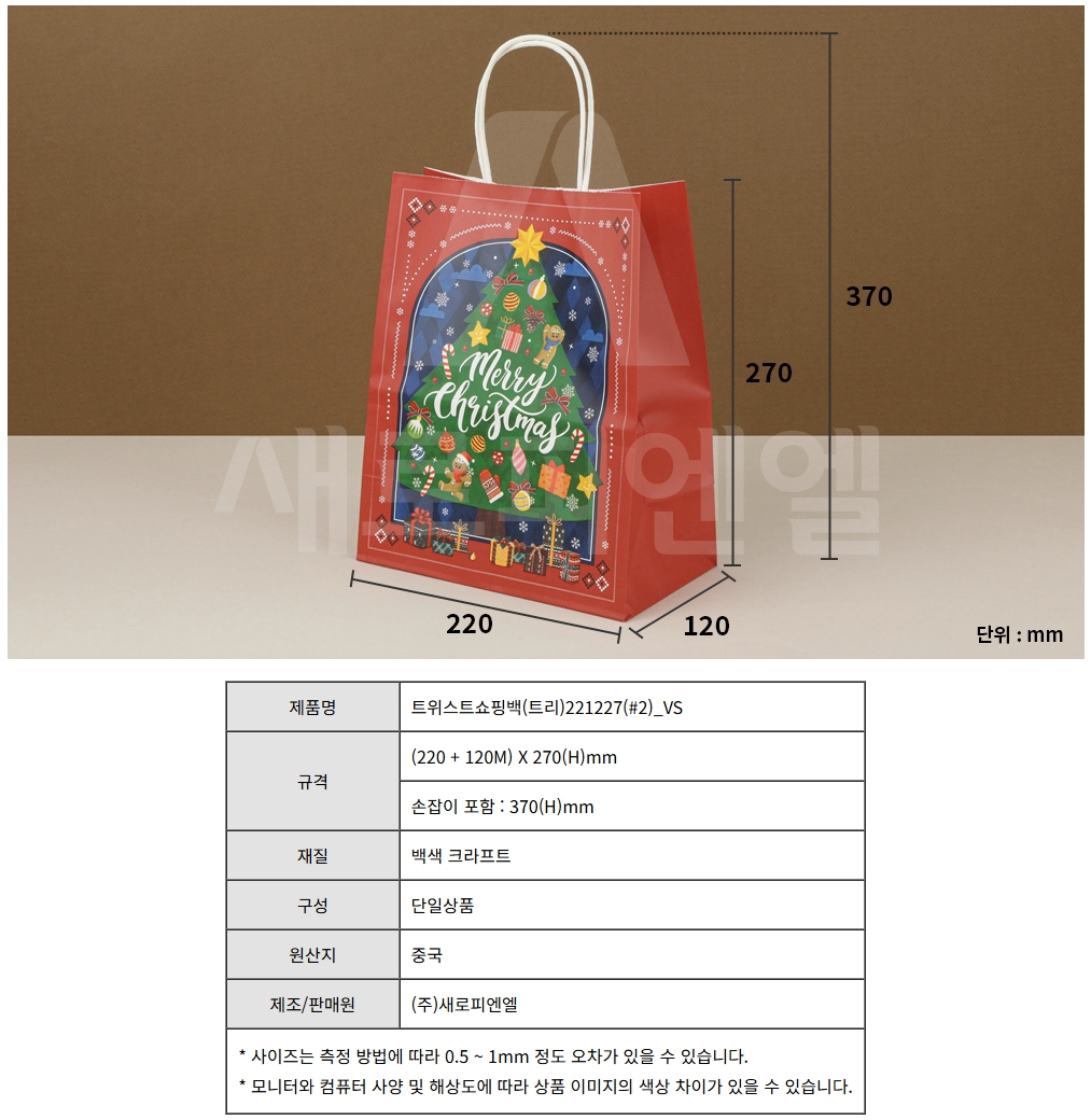 트위스트쇼핑백(트리)221227(#2)_VS / (220+120M)×270(H)mm, 5개 신상품