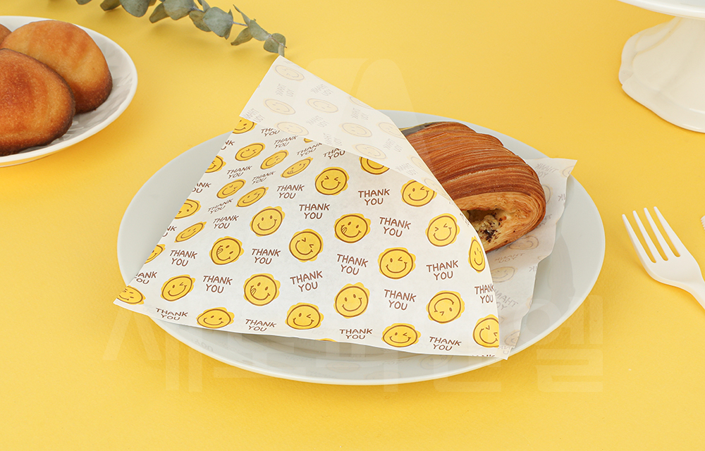 노란색과 초코색이 어우러진 귀여운 스마일 디자인과 땡큐 문구가 더해져 달콤하고 고소한 디저트와 잘 어울리며,