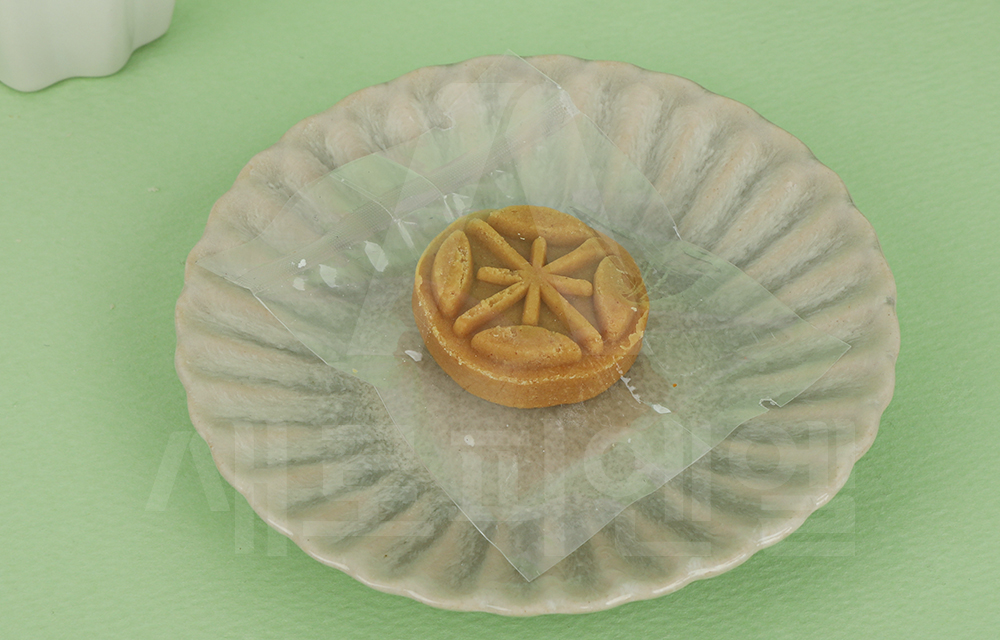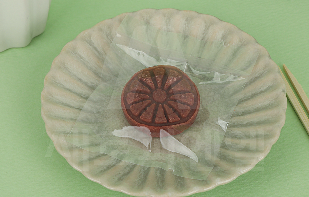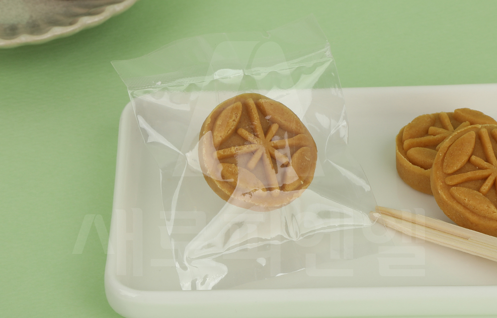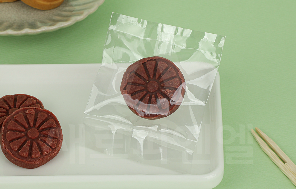 약과나 다식 한 개 또는 작은 강정과 한과류를 담기 좋은 투명 소재의 쿠키 봉투입니다.