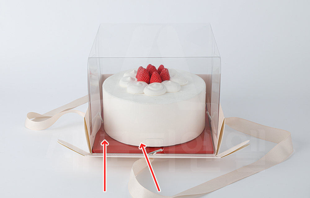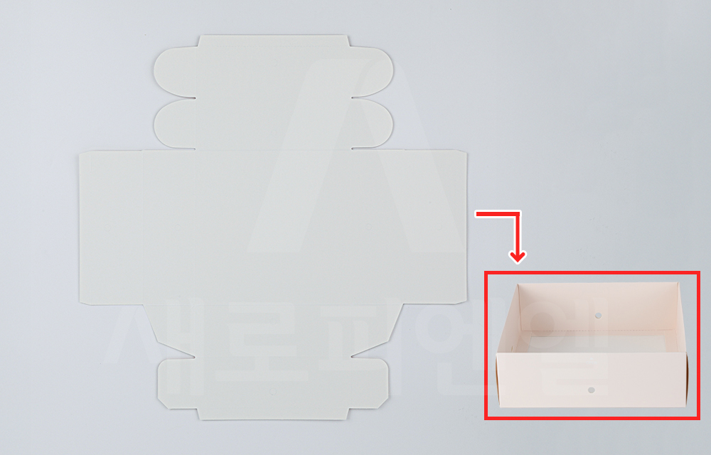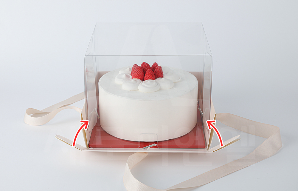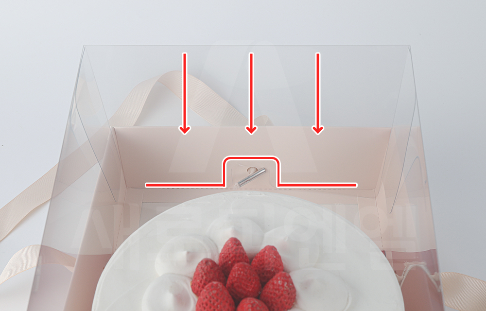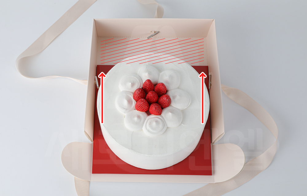 박스 안에 여유 공간을 두고, 케익박스 하판을 밀어 넣습니다.