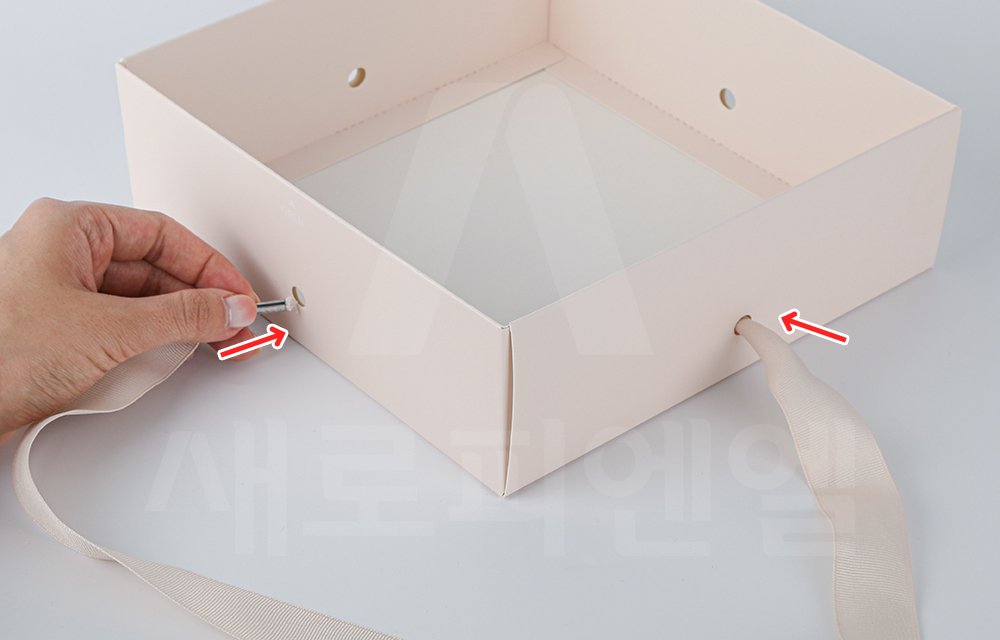완성된 박스 옆면 구멍에 끈을 교차시켜 끼워 넣습니다.
