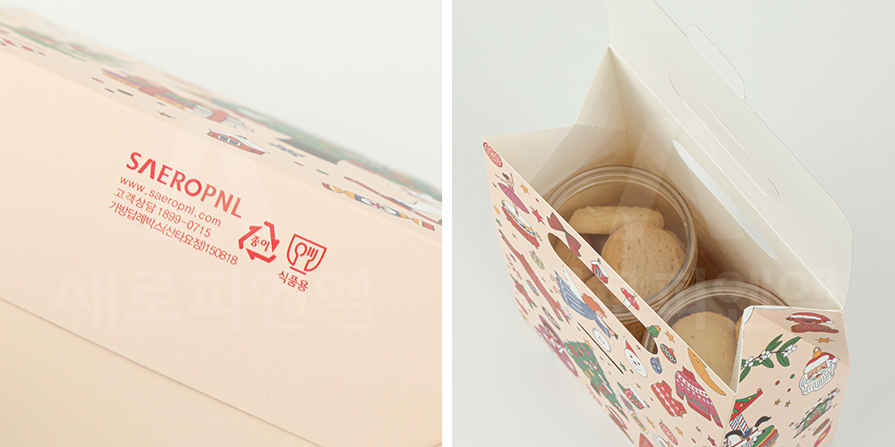 식품지를 사용하여 식품 포장에 적합하며, 박스 내부에 음식물이 닿아도 안전하게 섭취할 수 있습니다.