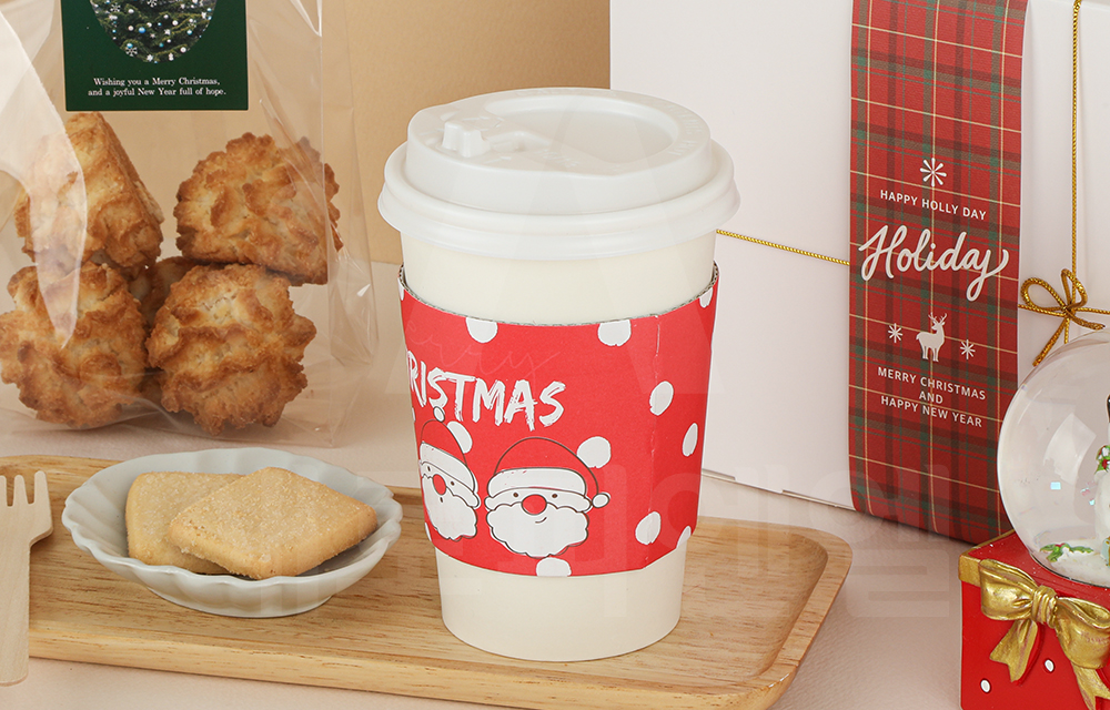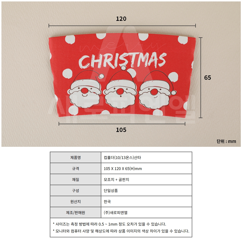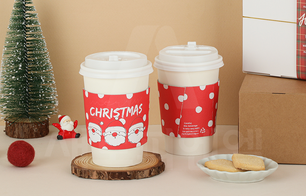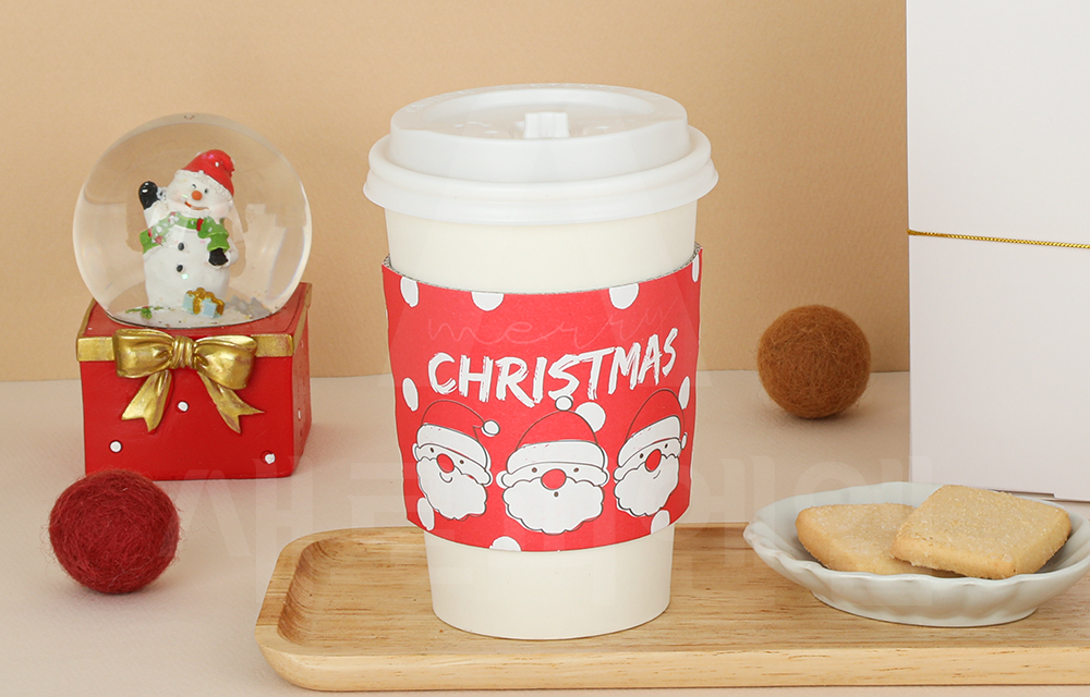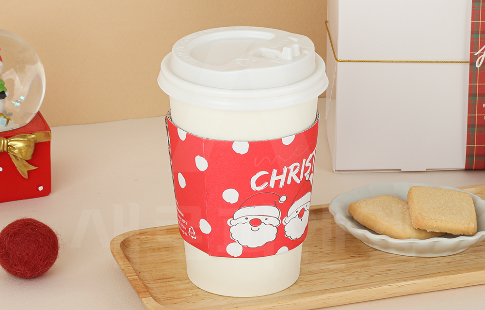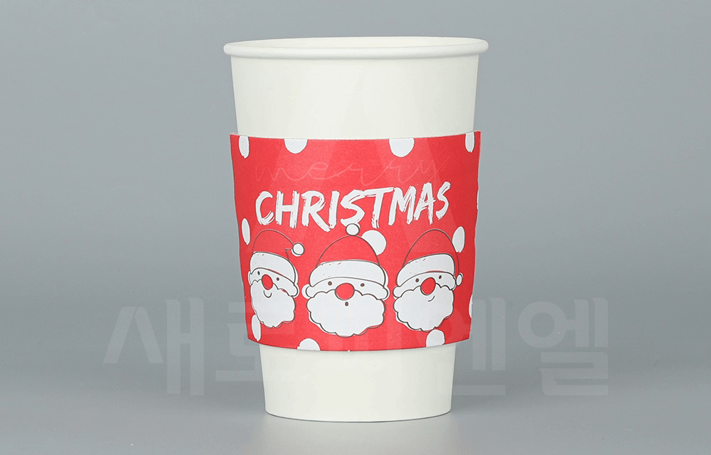 귀여운 산타와 눈송이 패턴이 어우러진 크리스마스 시즌 컵홀더입니다.