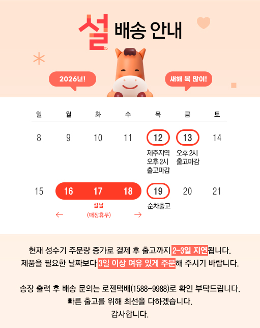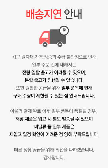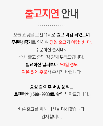 3,000원 (60,000 이상은 무료배송이나 부피와 무게에 따라 추가배송비 발생)