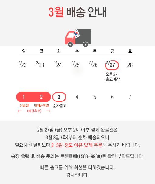 3,000원 (60,000 이상은 무료배송이나 부피와 무게에 따라 추가배송비 발생)
